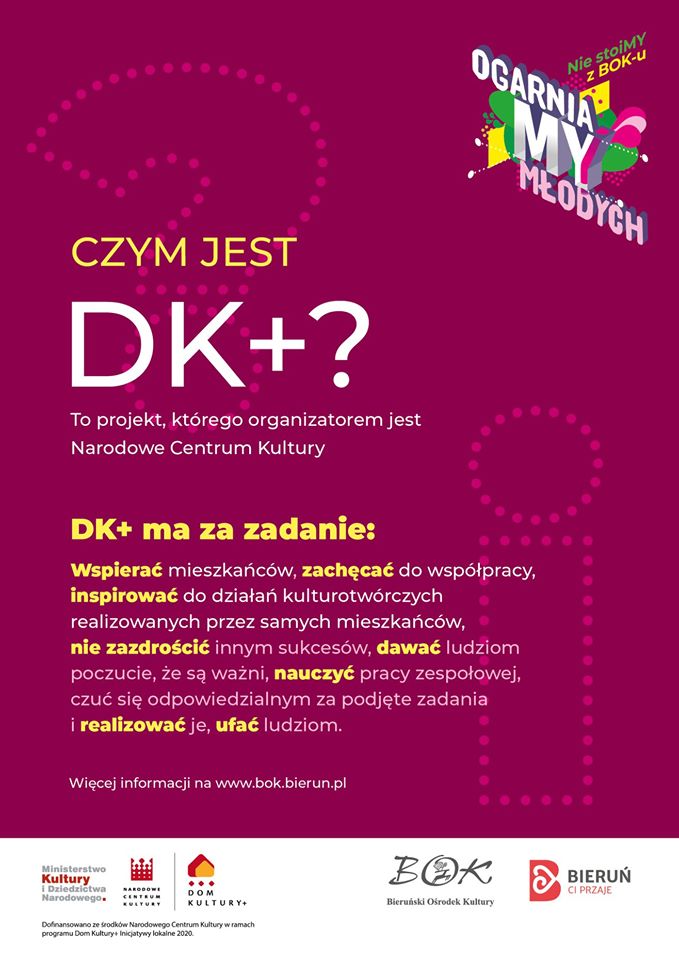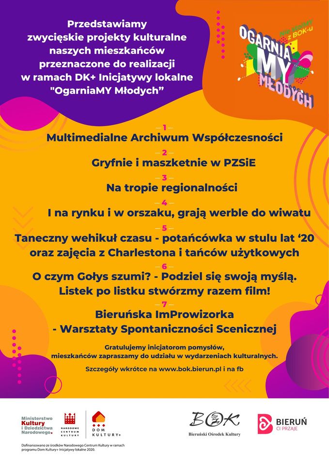 Bieruński konkurs na inicjatywy lokalne przebiegał pod hasłem „Nie stoimy z BOK-u! OgarniaMY Młodych”. Celem było włączenie mieszkańców Bierunia w aktywne współtworzenie oferty kulturalnej miasta. Akcja skierowana była przede wszystkim do ludzi młodych, ale – jak podkreślali organizatorzy -górna granica wieku (szczególnie, gdy ktoś jest młody duchem) nie była określona. Dlatego wśród wybranych projektów wiele jest działań międzypokoleniowych, które mogą wciągnąć każdego, niezależnie od wieku.