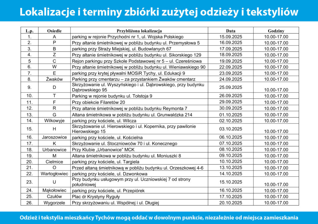 W okresie od 15 września do 20 października b.r. w godzinach od 10.00 do 17.00, jeden dzień w danej lokalizacji, zgodnie z przedstawionym poniżej harmonogramem ustawione będą pojemniki, do których mieszkańcy będą mogli oddać zużyte tekstylia, odzież czy obuwie.
