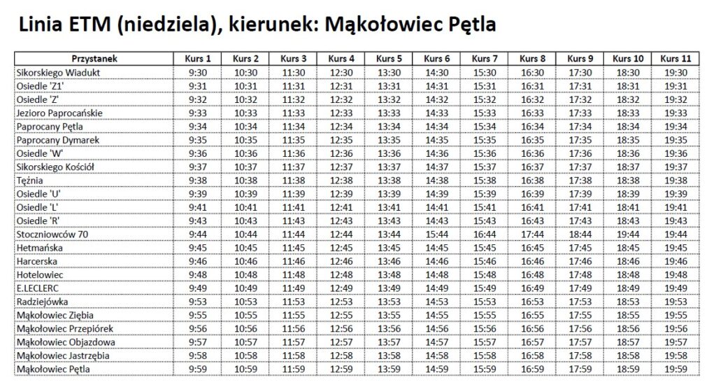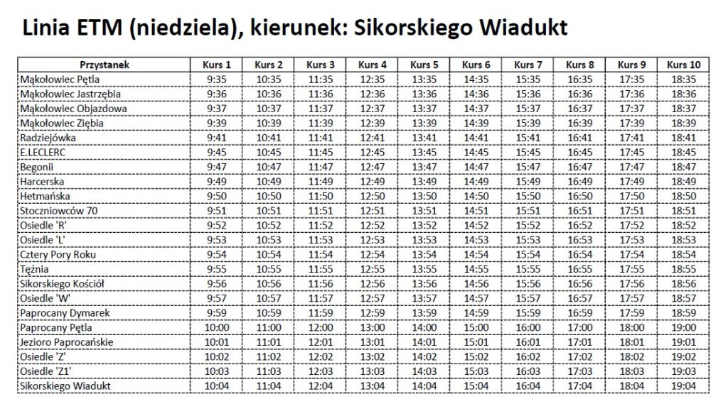 Niedziela (21.09): Mąkołowiec Pętla ↔ Sikorskiego Wiadukt