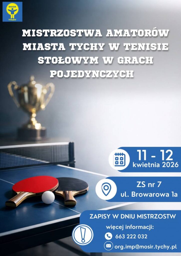 Miejski Ośrodek Sportu i Rekreacji w Tychach organizuje Mistrzostwa Amatorów Miasta Tychy w Tenisie Stołowym w grach pojedynczych. Impreza odbędzie się w dniach 11-12 kwietnia 2026 r. w Zespole Szkół nr 7 przy ul. Browarowej 1a, we współorganizacji z tą szkołą.